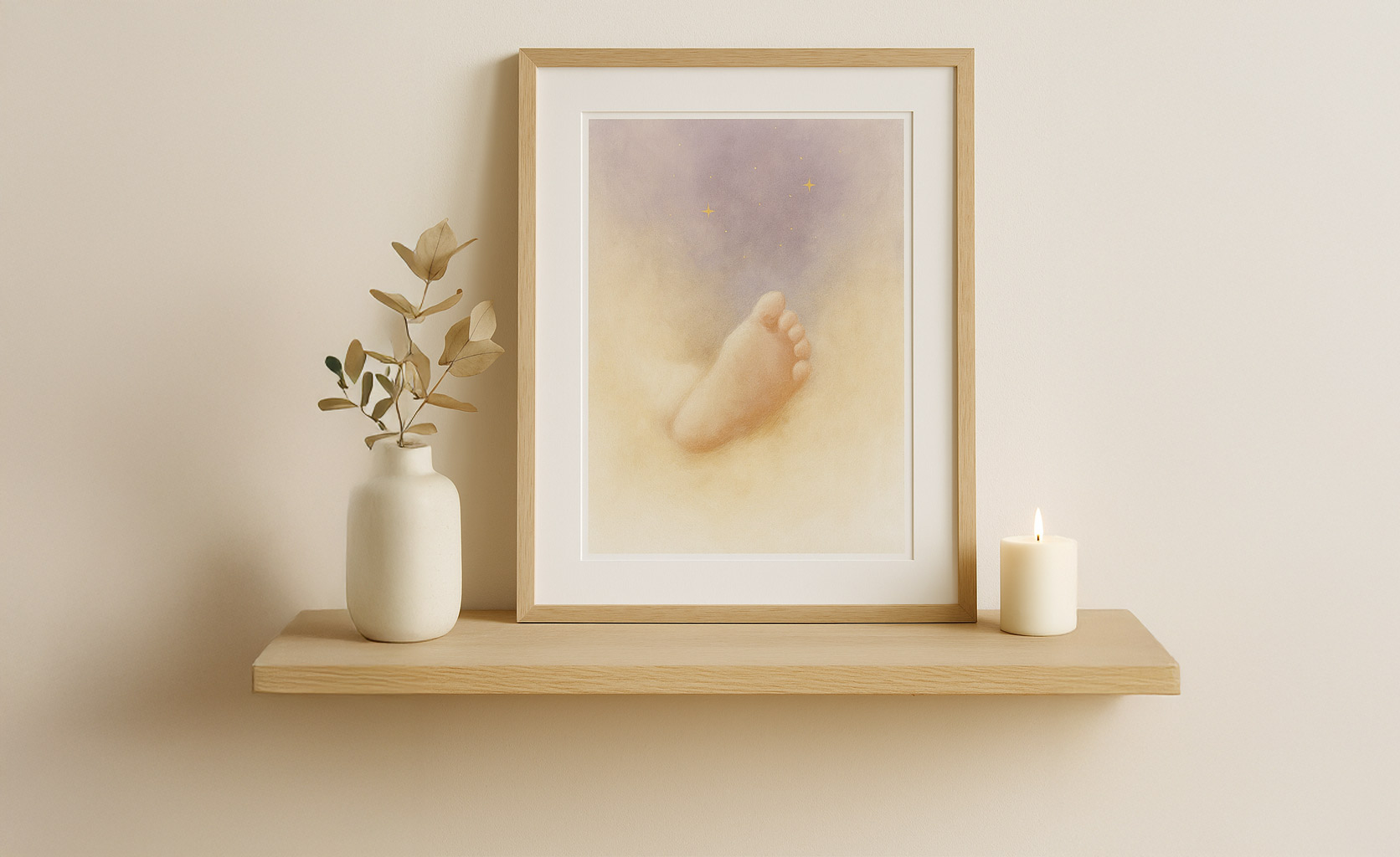 Een klein voetje, voor altijd groot in hun hart. Een herinnering aan een leven dat kort was, maar oneindig veel liefde bracht. Dit werk is een zacht eerbetoon aan een ster die blijft schijnen.