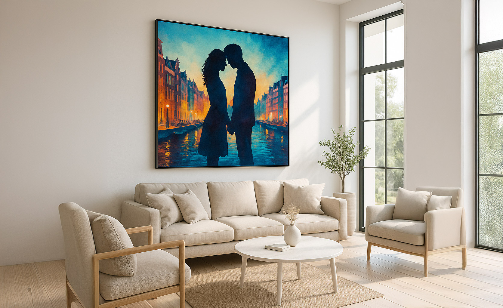 Hun eerste moment samen. De plek waar alles begon, het gevoel dat nooit verdween. Dit werk vangt niet enkel hun silhouetten, maar ook de stilte, de zon, de belofte van toen.